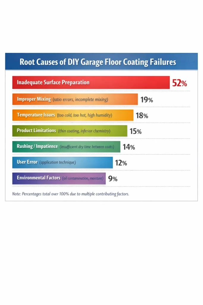 More than half (52%) of DIY garage floor coating failures result from inadequate surface preparation, followed by improper mixing (19%) and temperature issues (18%)—highlighting the specialized knowledge and equipment required for successful installation.