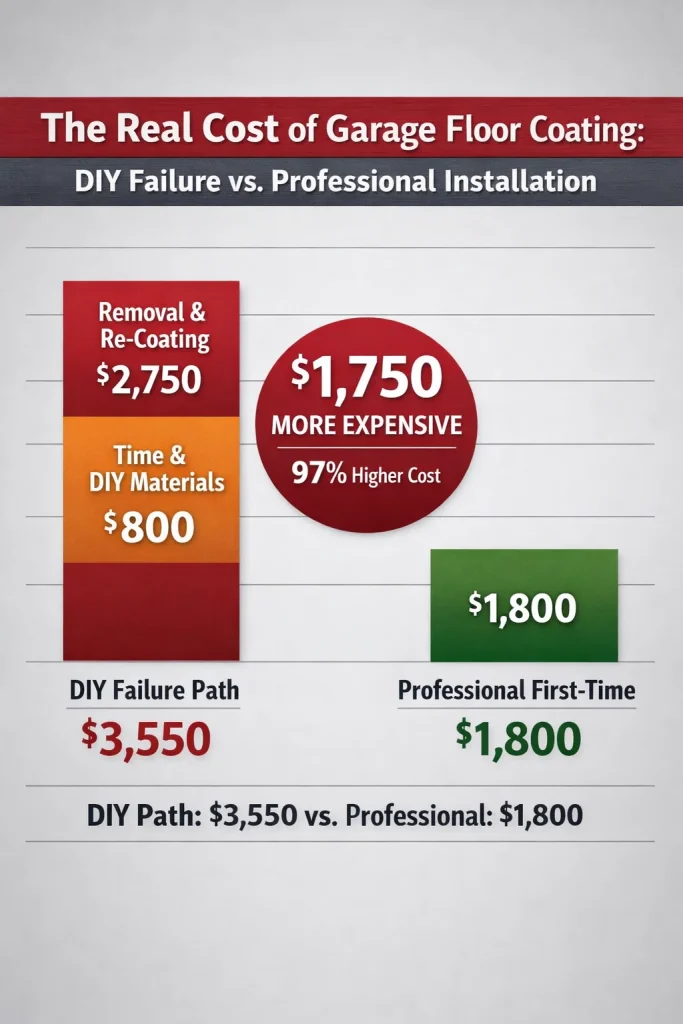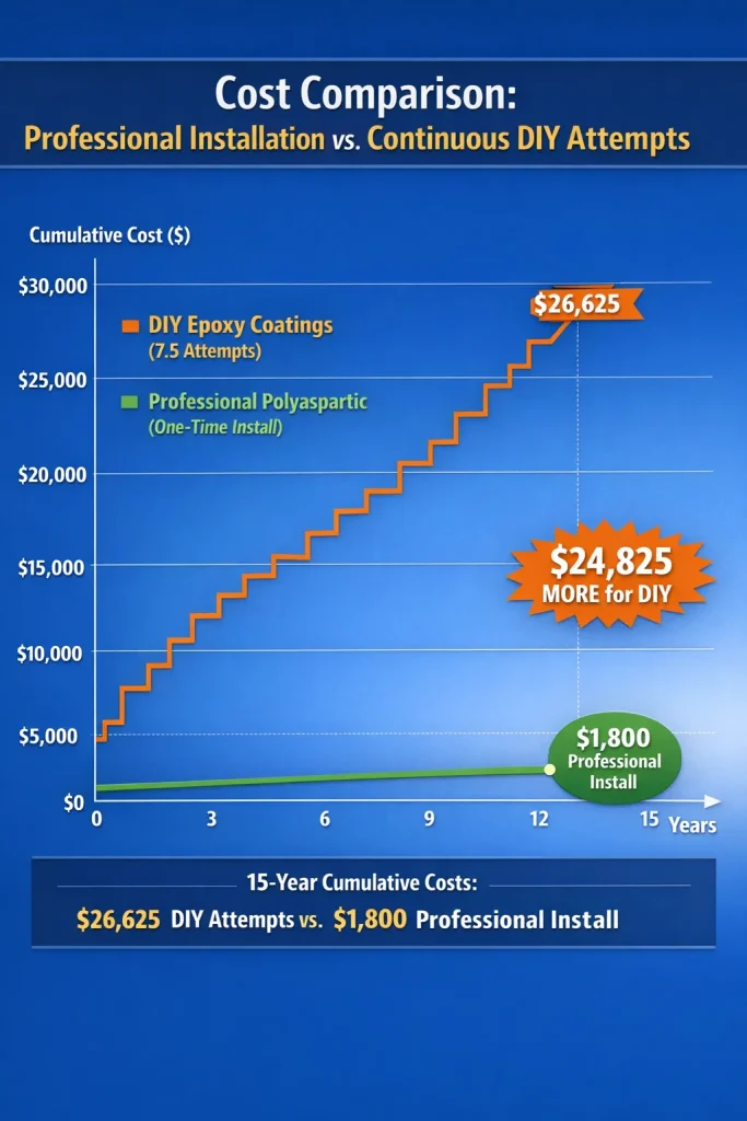 DIY epoxy coatings that fail every 18-24 months create a continuous replacement cycle. Homeowners who persist with DIY attempts spend approximately $1,775 per year on garage floor coating when amortized over time ($3,550 per attempt ÷ 2 years).