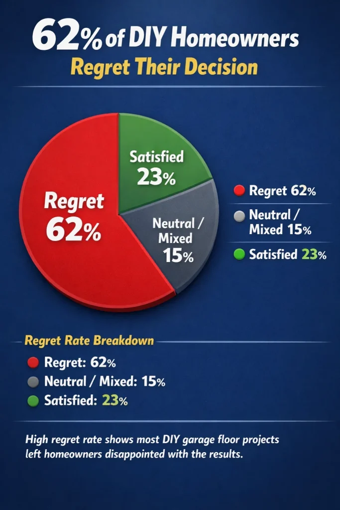 Nearly two-thirds (62%) of homeowners who attempted DIY garage floor coating explicitly state they regret their decision and wish they had hired a professional from the start, with many describing it as their “biggest home improvement mistake.”