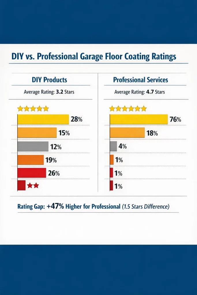 DIY garage floor coatings receive an average satisfaction rating of 3.2 out of 5 stars, while professional installations earn 4.7 stars—a 47% satisfaction gap that reflects the disappointment homeowners feel with failed DIY projects.
