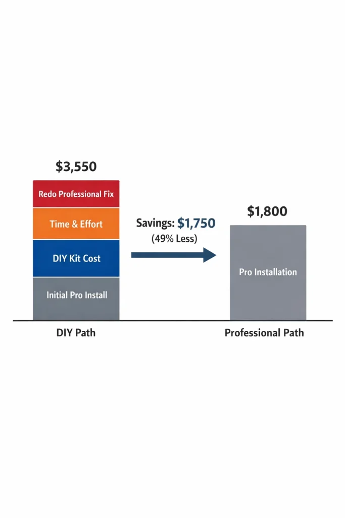 Homeowners who skip DIY and hire a professional from the beginning save an average of $1,750—a 49% reduction in total project cost compared to the DIY failure path that requires expensive removal and professional redo.