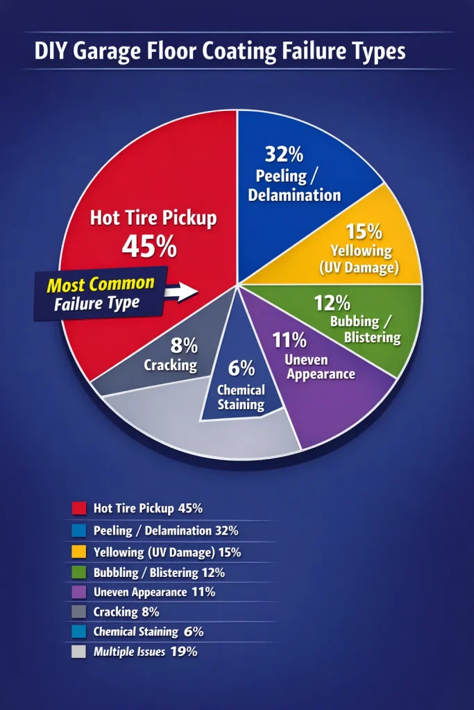Hot tire pickup—where car tires lift the coating off the concrete—accounts for 45% of all DIY garage floor coating failures, followed by peeling (32%) and yellowing (15%)—issues rarely seen in professional installations using polyaspartic coatings.