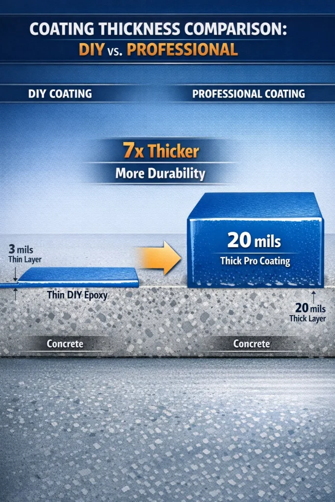 Professional garage floor coatings average 20 mils in thickness compared to DIY kit coatings at just 3 mils—7 times thicker—explaining the dramatic difference in durability, performance, and resistance to hot tire pickup.